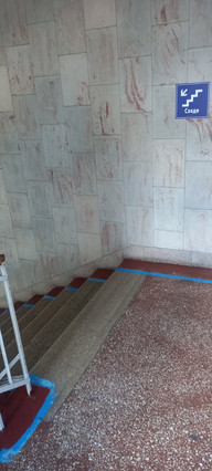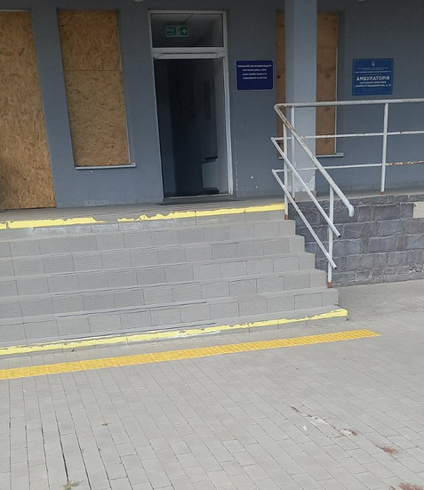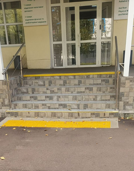 3. Перед сходами встановлена тактильна плитка — спеціальне покриття з рельєфною поверхнею, яке допомагає людям з порушеннями зору безпечно орієнтуватися.